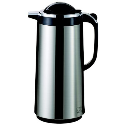 Ergonomically friendly carafe with push-button in handle Brushed StainlessBlack finish Ergonomically friendly carafe with pushbutton in handle Brushed stainlessBlack finish